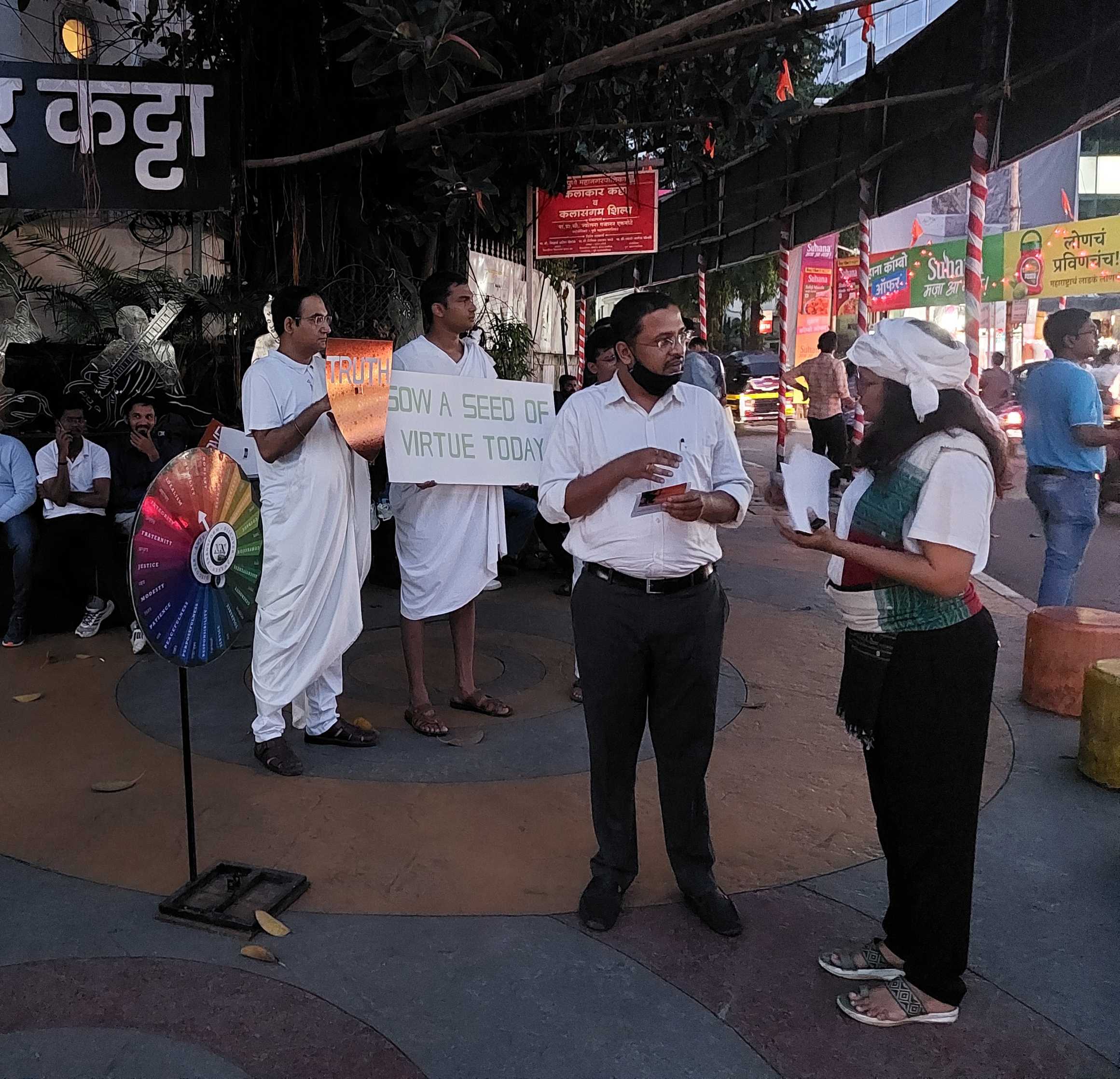 On Sunday, 4th September 2022, volunteers from New Acropolis Pune conducted a street engagement at Kalakar Katta on Fergusson College road. Dressed as warrior-philosophers of peace, the members held up a banner with the words ‘Sow a seed of virtue today’, carried shields with virtues and interacted with people, inviting them to spin the Wheel of Virtues and put into practice the virtue the wheel stops at, at least for a day.